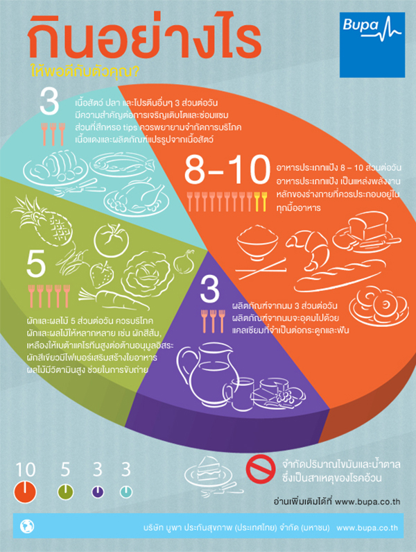 - ทานอาหารประเภทแป้งให้ได้ 8-10 ส่วนต่อวัน เพราะเป็นแหล่งพลังงานหลักที่ร่างกายควรได้รับ จึงจำเป็นต้องประกอบอยู่ทุกมื้ออาหาร