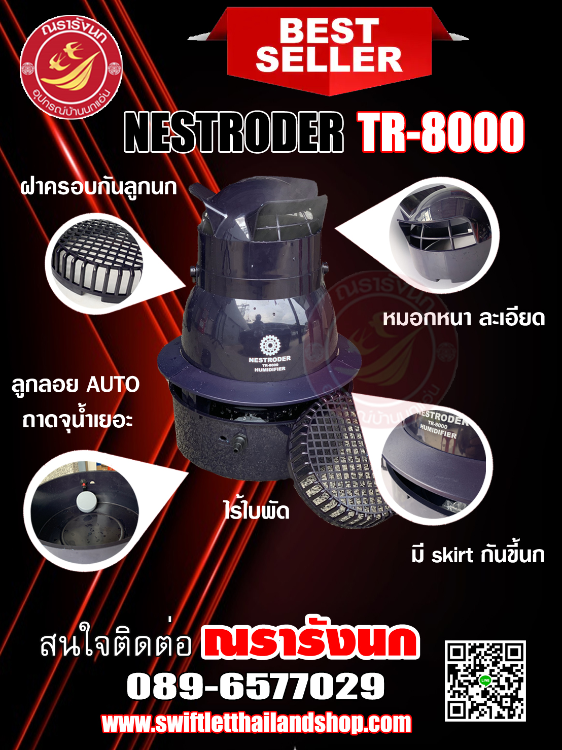 TR-8000 - NESTRODER TR-8000 SUPER HUMIDIFIER โฉมใหม่.ไร้ใบพัด..ลดเสียงดังรบกวนนก..สุดยอดพลังขับหมอก ด้วยอัตราการหมุนของมอเตอร์ที่ 6000 รอบ/นาที มาพร้อม Skirt และฝาครอบกระจายหมอกดีไซด์ใหม่ล่าสุด ถึง 2 แบบ 2 สไตล์ ทั้งแบบกระจาย 3 ทิศทางมีตะแกรงป้องกันนกทุกช่อง และฝาตะแกรงหมากรุก ขับหมอกสูง 2.5-3.5 เมตร ครอบคลุมพื้นที่ 30 ตร.ม.