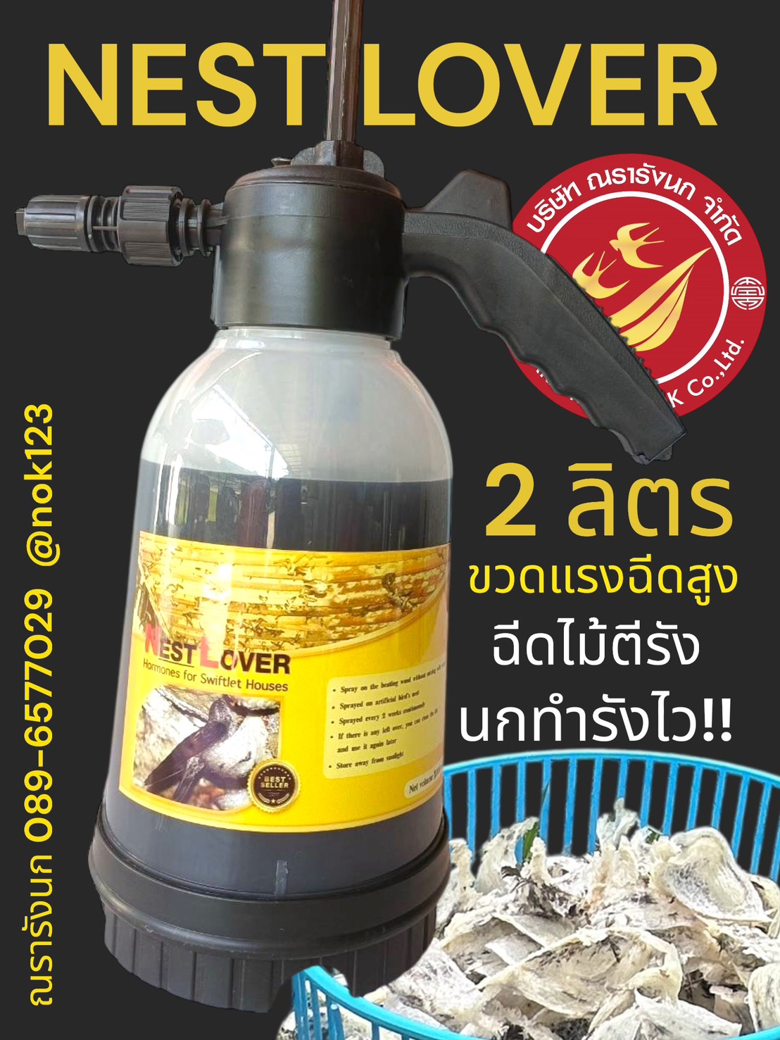NEST LOVER ฮอร์โมนฉีดไม้ตีรังยอดนิยม ดึงนกนอนทำรังรวดเร็ว 2 ลิตร มาในขวดแรงฉีดสูง การใช้งานโดยฉีดพ่นบนไม้ตีรัง ไม่ต้องผสมน้ำ จะช่วยดึงดูดนกให้นอนทำรังได้อย่างรวดเร็ว
