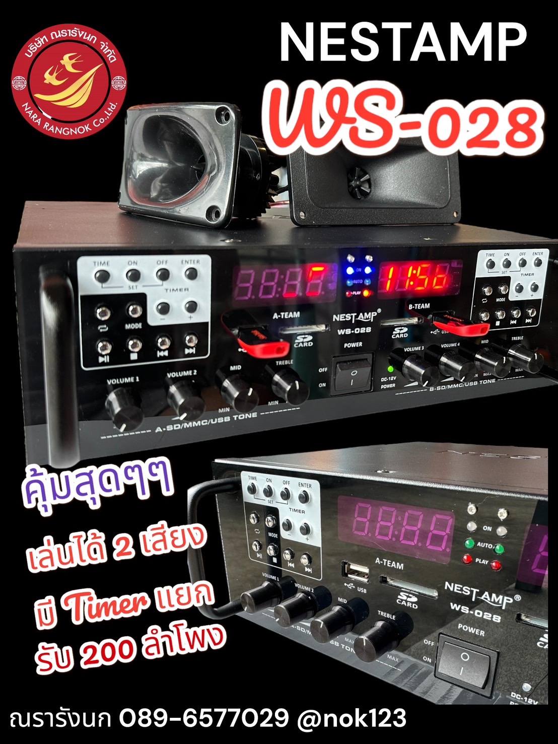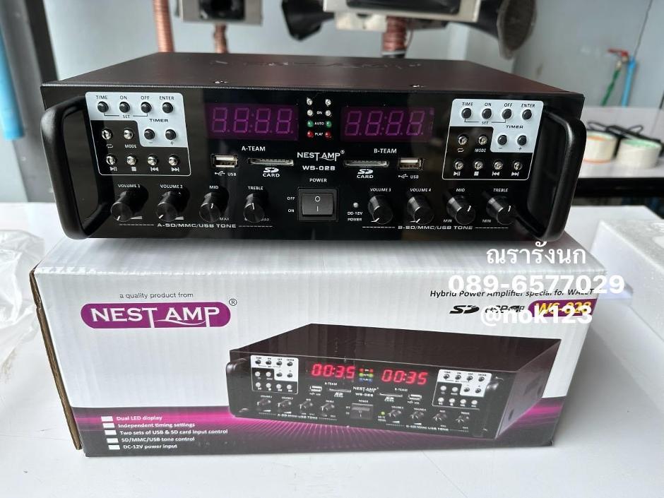 NEST AMP WS-028 เครื่องเสียงเรียกนก 2in1 มี 2 ชุดในเครื่องเดียว พร้อมทาใเมอร์ตั้งเวลาในตัว ทำงานแยกอิสระ กำลังขับ Tweeter ที่ 200 ตัว อ่านได้ทั้ง USB และ SD Card มีพัดลมระบายความร้อนในตัว ซื้อ 1 ได้ถึง 2 คุ้มสุดๆ